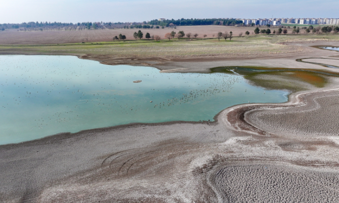 Çekilmenin etkisiyle daralan ve kuruma tehlikesi yaşayan gölün tabanındaki çamurda besin bulmaya çalışan kuşlar, havadan görüntülendi. Gölette geçen ay kaydedilen görüntüler, çekilmenin boyutunu gözler önüne serdi.