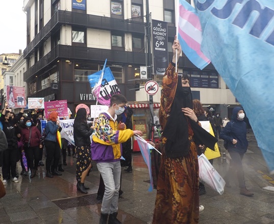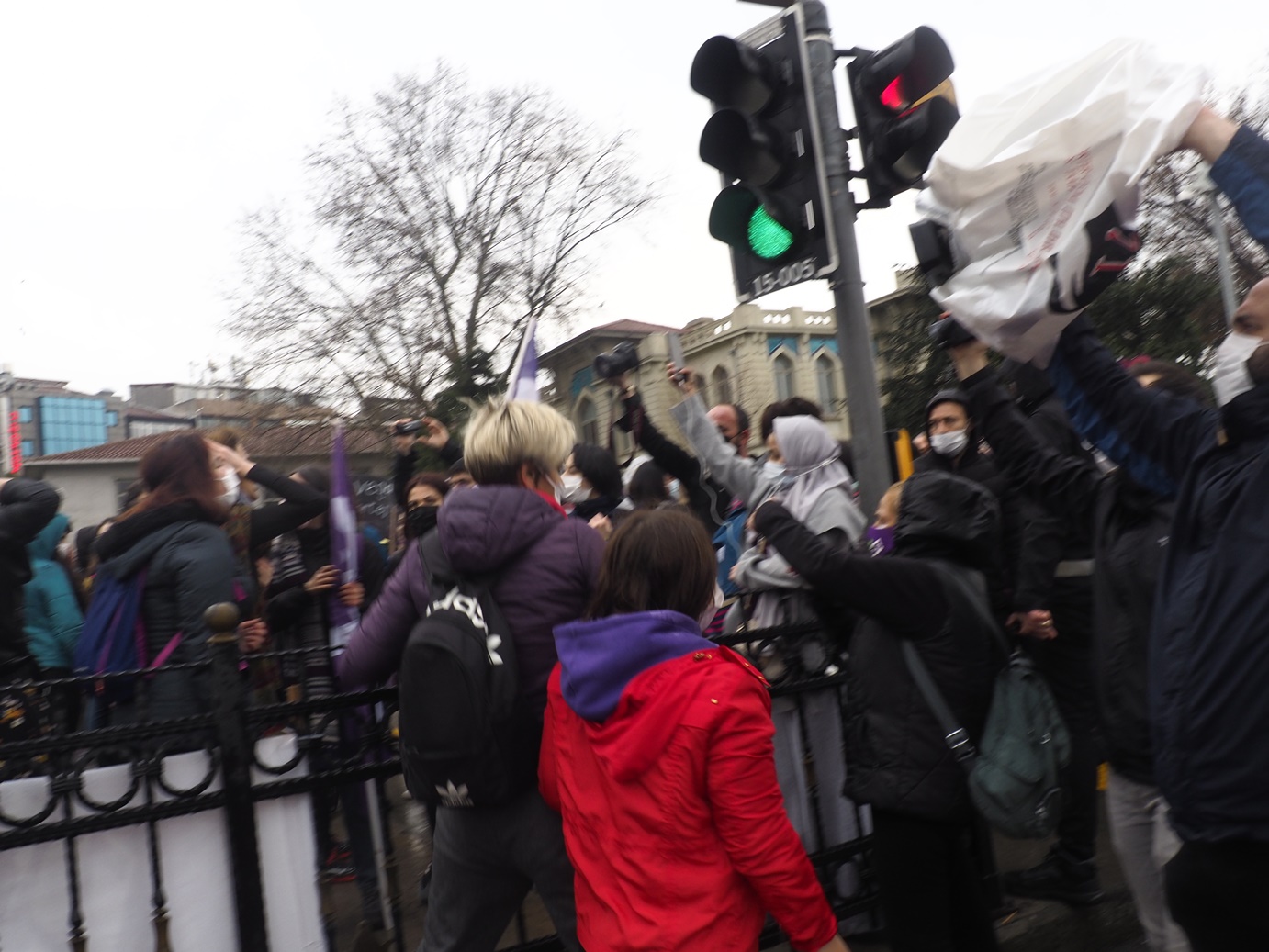 Kadınlar alana girerken trans bireylerin oluşturduğu kortejin alana girmesini polisin izin vermemesi üzerine gerginlik oluştu. Trans bireylerin oluşturduğu kortejinin çevresinde bulunan Yeşil Sol Parti kadınlarının ve diğer yakındaki kadın örgütlerinin trans kortejini yalnız bırakmayarak direnmeleri sonucu polisle kısa bir arbede yaşandı. Meydandaki diğer kadınların da trans bireylerle dayanışmak için gelmesiyle polis geri adım atarak kortejin alana girmesine izin verdi. Eylemin bitirilmesinden sonra bazı trans bireylerin gözaltına alınıldığı öğrenildi.