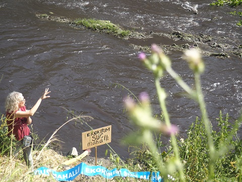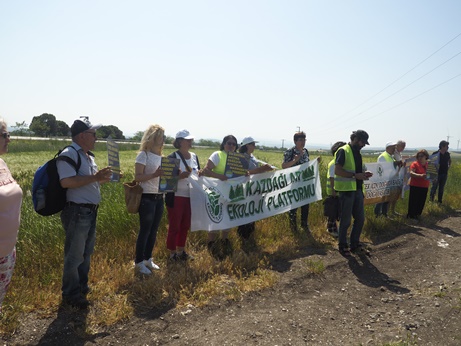 Bandırma yolu üzerinde kervana Güney Marmara Dayanışması katıldı ve Marmara Denizi’ne dökülen Gönen çayında incelemede bulunuldu. Başta deri sanayisi olmak üzere endüstriyel atık sularla “çok kirli su” olarak nitelenen Gönen çayı, halen tarımsal sulamada kullanılmakta, bu durum yetiştirilen ürünlerde ciddi sağlık risklerine yol açmaktadır. Ardından Beyköy’de, köylülerin elinden alınan 1.sınıf tarım arazilerinde yapımına başlanan Metal İhtisas OSB inşaatı görüntülendi. Balıkesir-Çanakkale çevre planlarına aykırı olarak yapımına başlanan bu OSB, Marmara Denizi kirliliğini ve bölgedeki nüfus baskısını önemli oranda arttıracak, Kapıdağ ve Manyas Kuş Cenneti’ndeki biyolojik çeşitliliği yok edecek, bölgenin sınırlı su kaynaklarını tüketecek, verimli tarımsal üretime darbe vuracak, sonuç olarak gıda arzındaki sorunlar artarak devam edecektir.